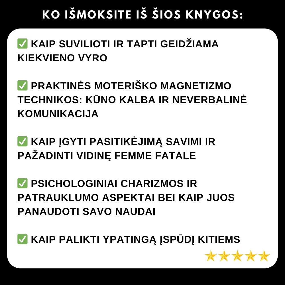 Jei esi pasiruošusi pažadinti savo vidinę vilioklę ir perimti savo gyvenimo bei santykių su vyrais kontrolę, knyga „Pažadink savo vidinę Femme Fatale“ yra tobula pradžia. Užsisakyk ją dabar ir pradėk savo virsmą į pasitikinčią savimi ir žavią moterį, kuri mėgaujasi gyvenimu pilna širdimi!