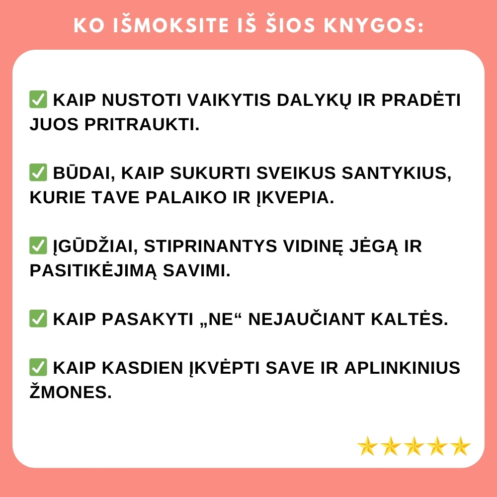 Ši knyga yra tavo vadovas pasitikėjimui savimi, aiškių ribų nustatymui bei tinkamų žmonių ir galimybių pritraukimui į savo gyvenimą. Be sudėtingų technikų išmoksi, kaip susitelkti į save ir tapti žmogumi, kuris įkvepia kitus.